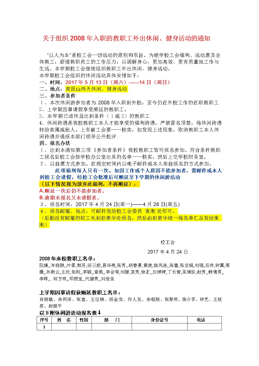 关于组织2008年入职的教职工外出休闲、健身活动的通知