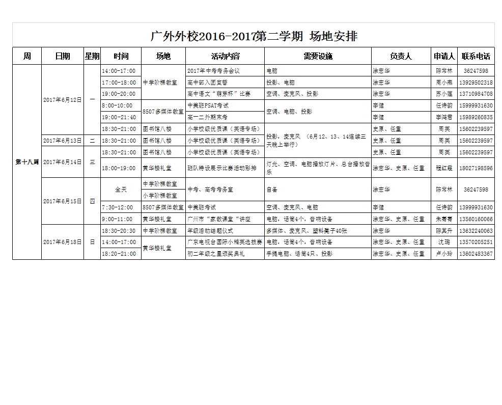 2016-2017第二学期 (第十八周)场地安排