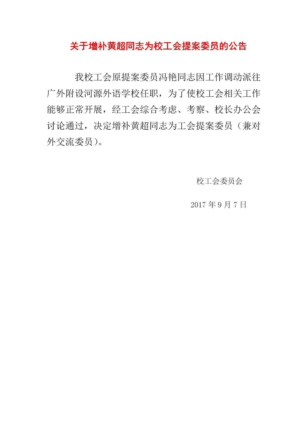 关于增补黄超同志为校工会提案委员的公告