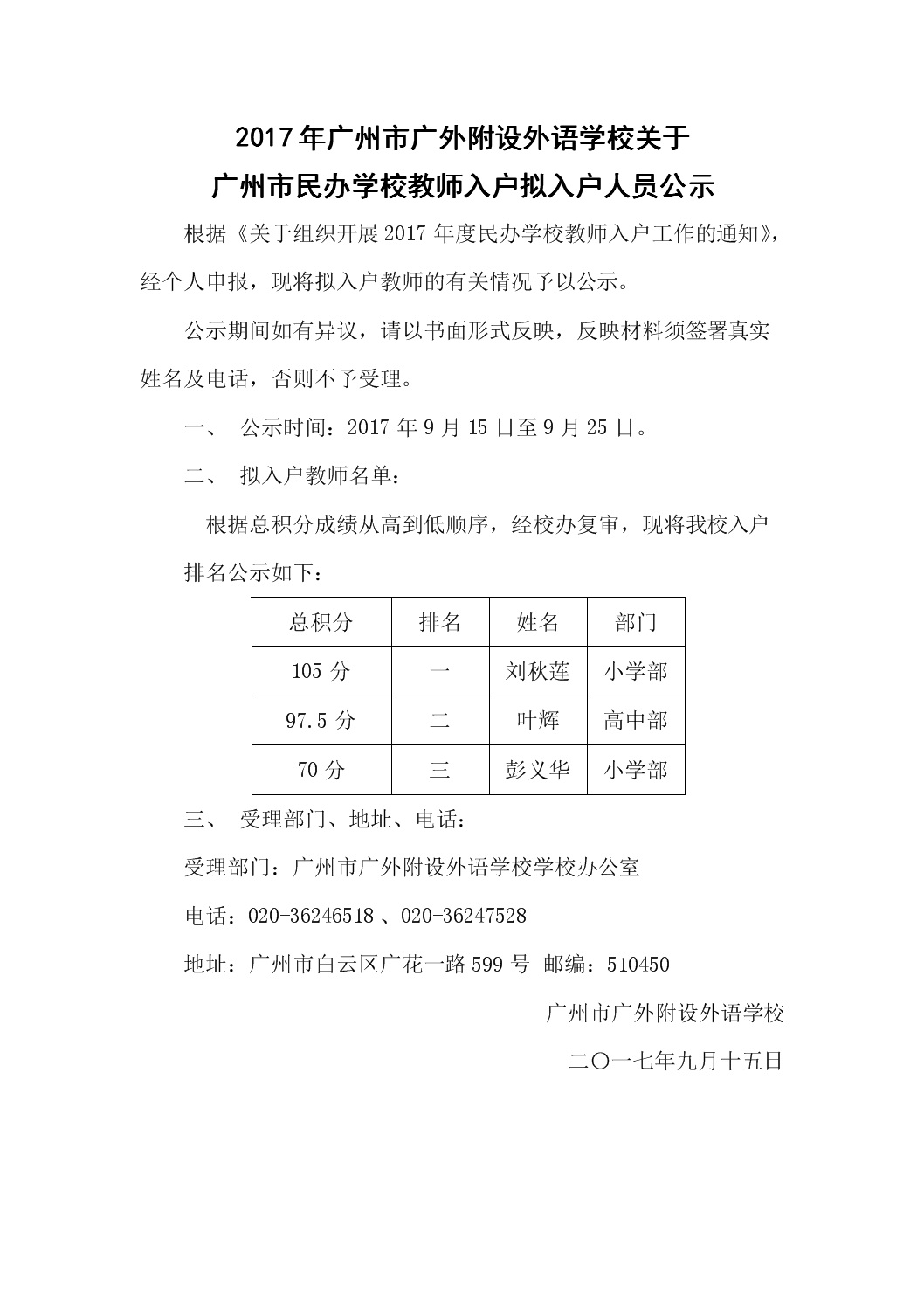 2017年广州市广外附设外语学校关于广州市民办学校教师入户拟入户人员公示