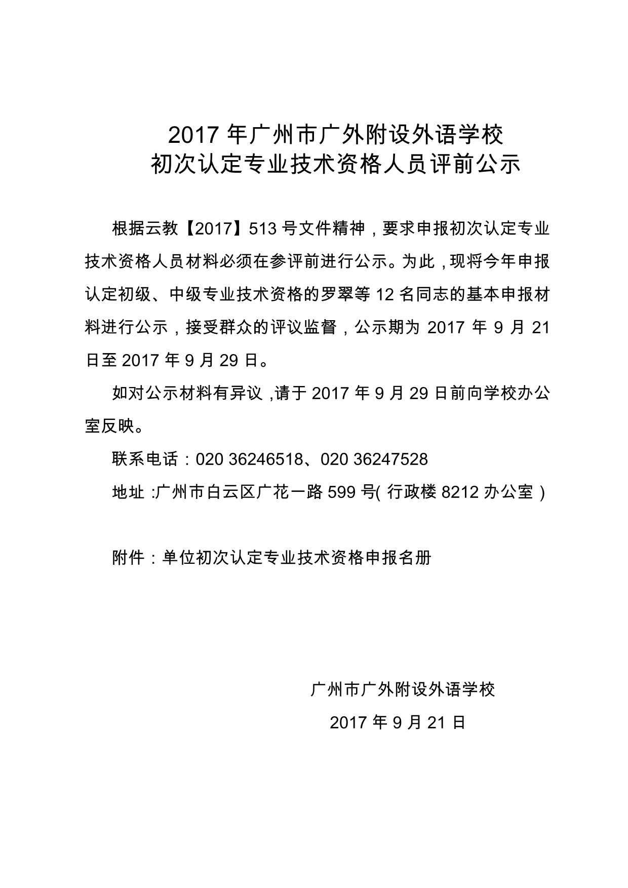 2017年广州市广外附设外语学校初次认定专业技术资格人员评前公示