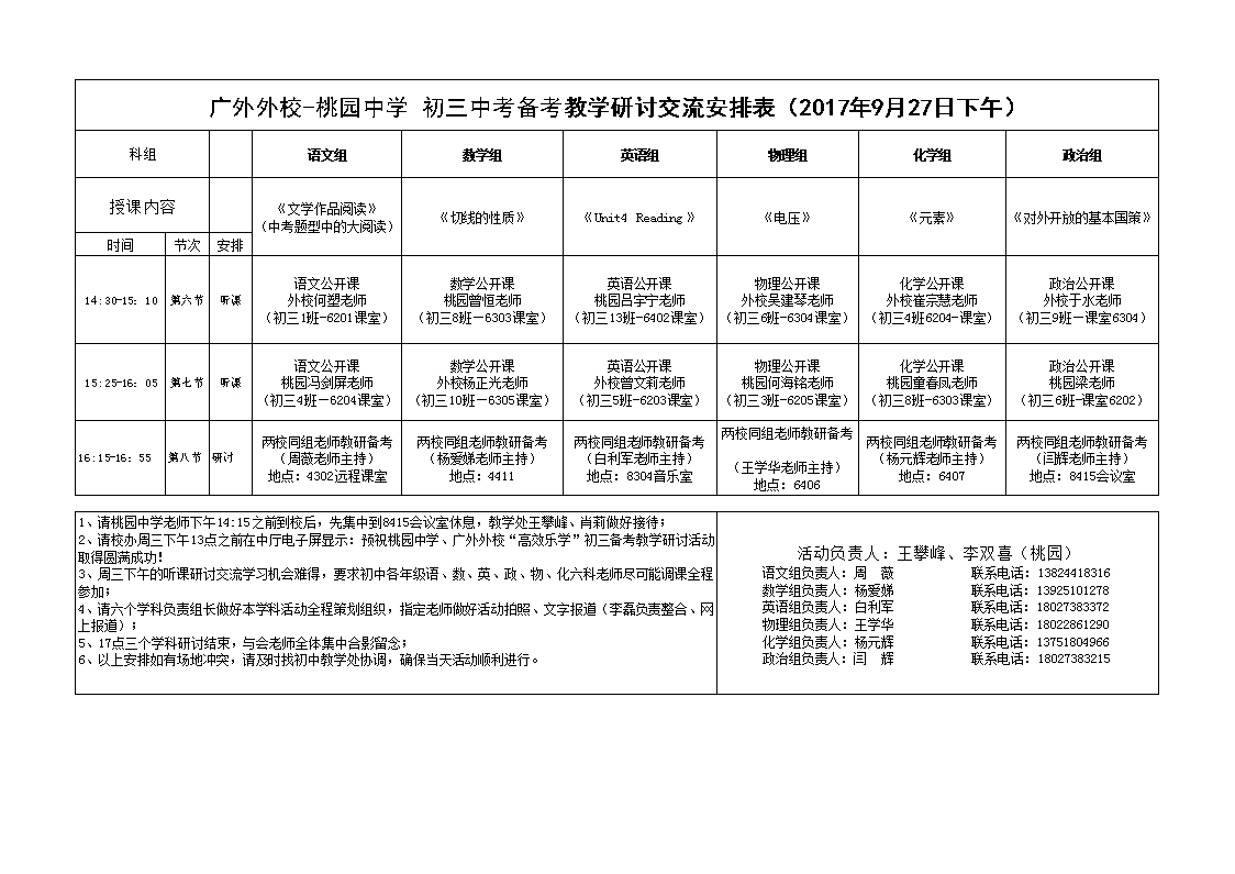 广外外校-桃园中学 初三中考备考教学研讨交流安排表(2017年9月27日下午)