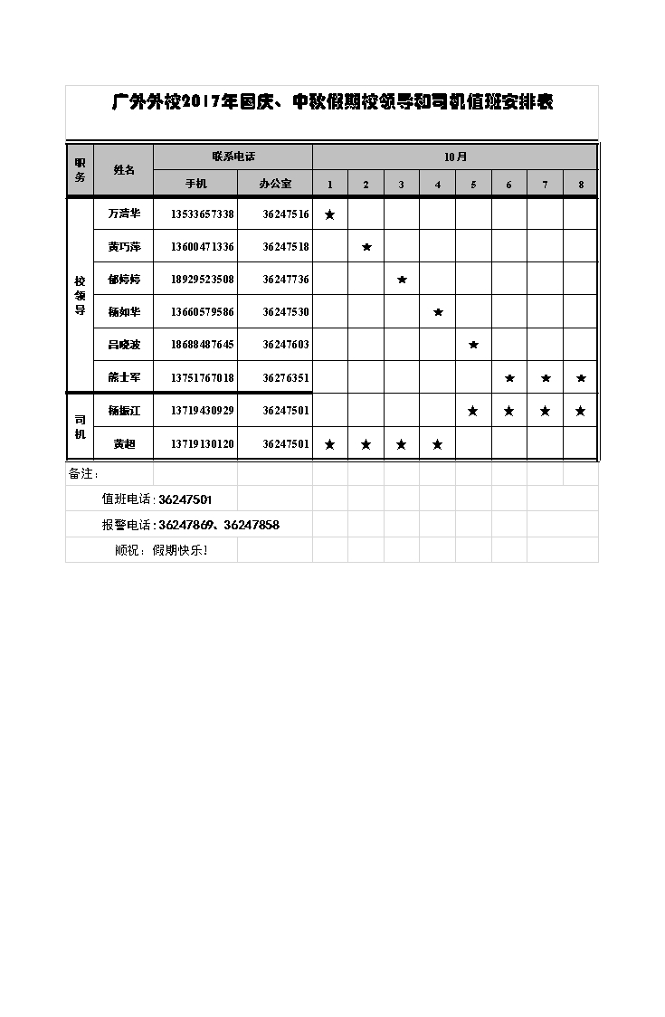 广外外校2017年国庆、中秋假期校领导和司机值班安排表