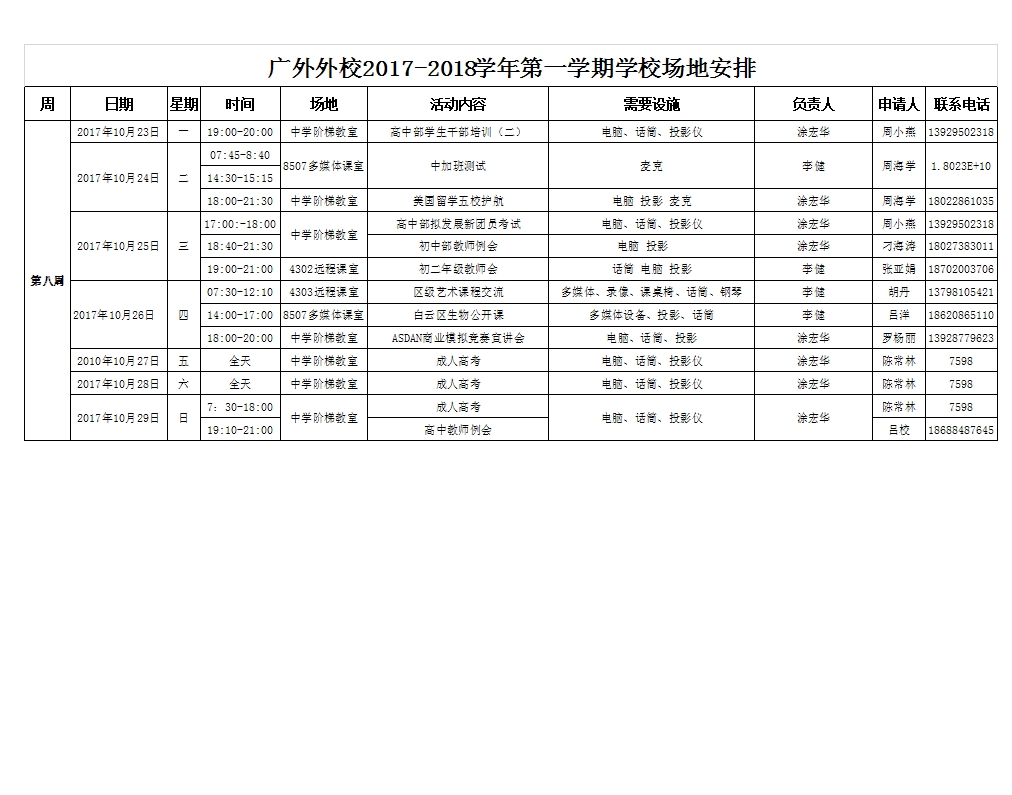 2017-2018第一学期(第八周)场地安排