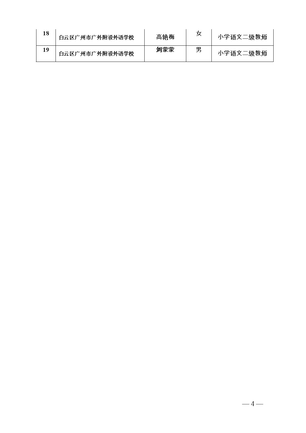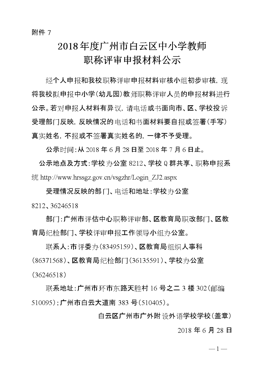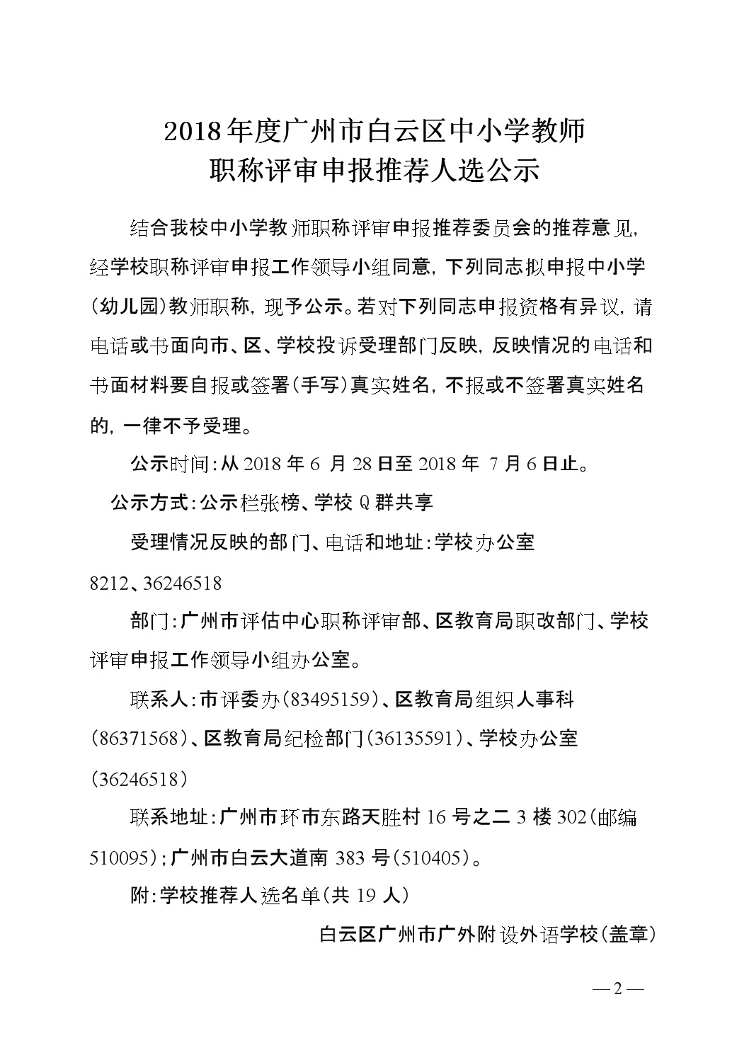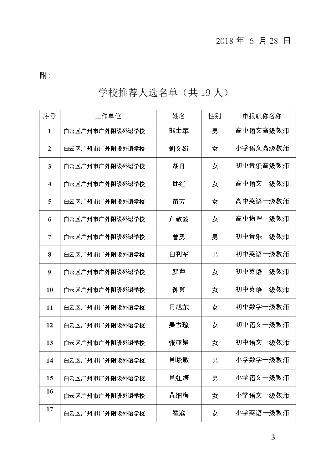 2018年广州市广外附设外语学校专业技术人员申报资格评前公示