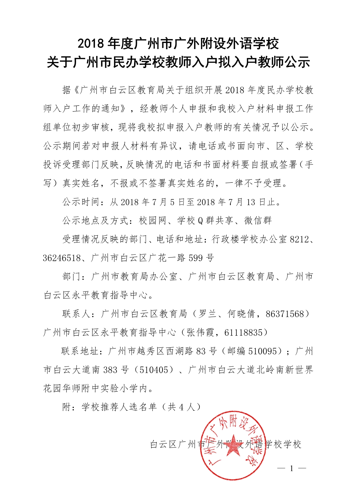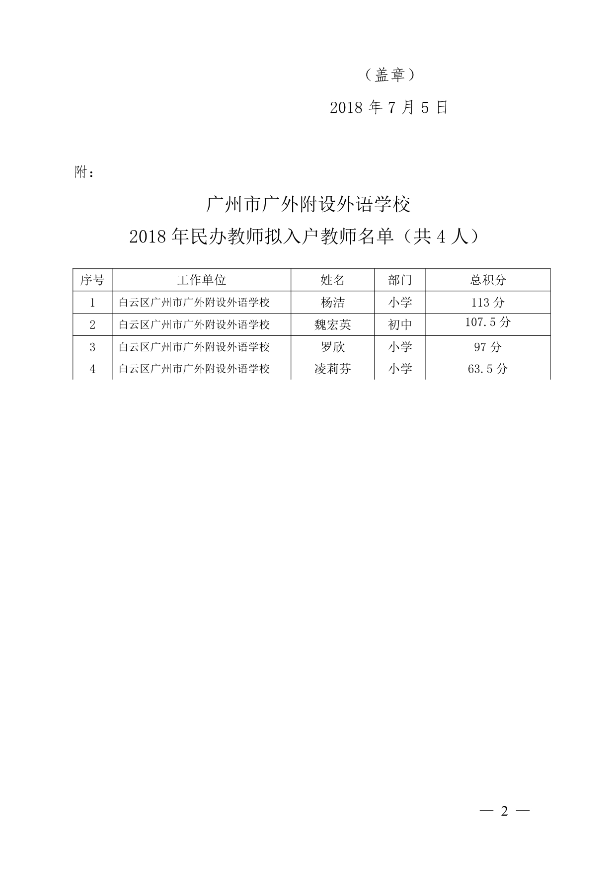 2018年度广州市广外附设外语学校关于广州市民办学校教师入户拟入户教师公示
