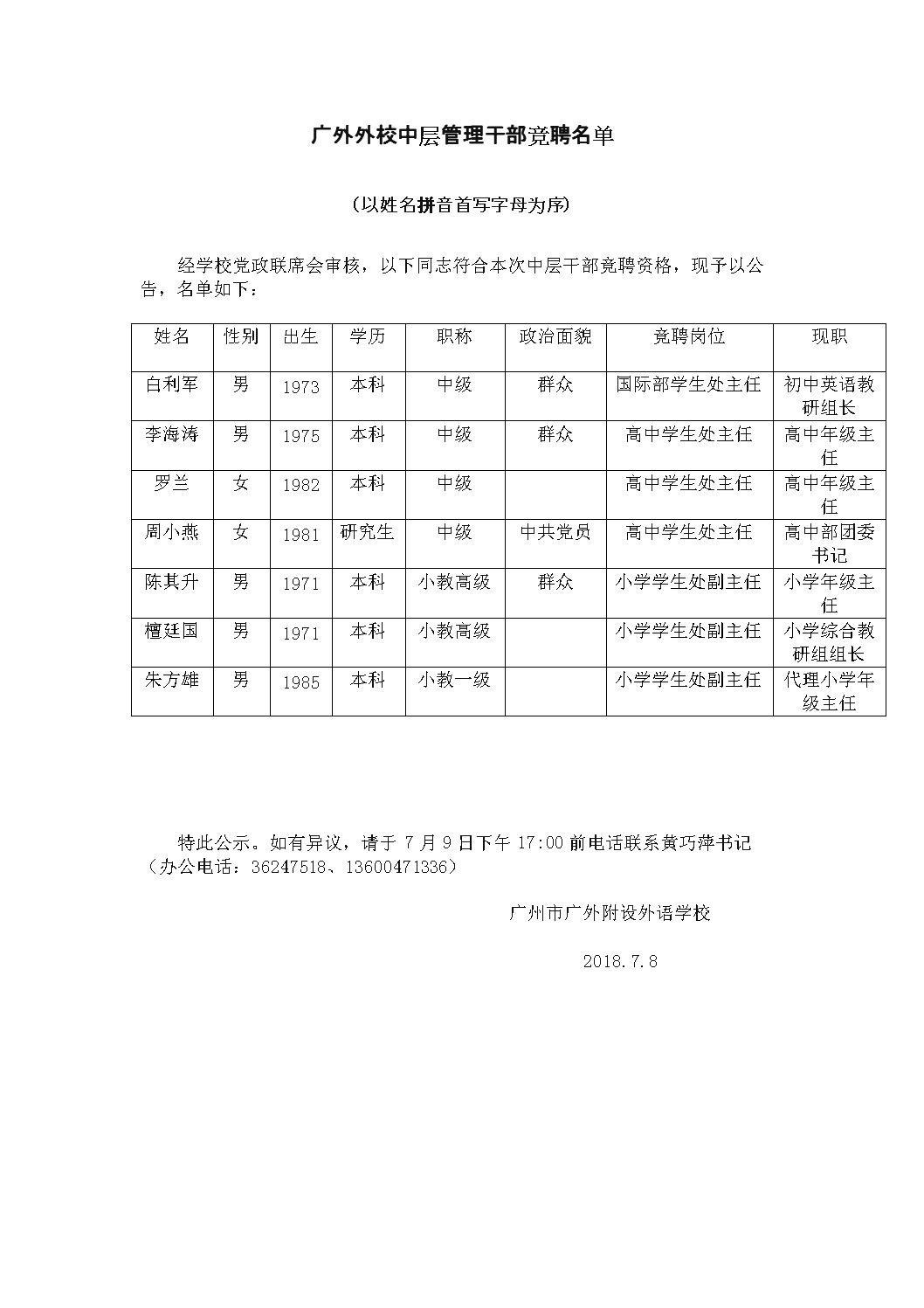 广外外校中层管理干部竞聘名单