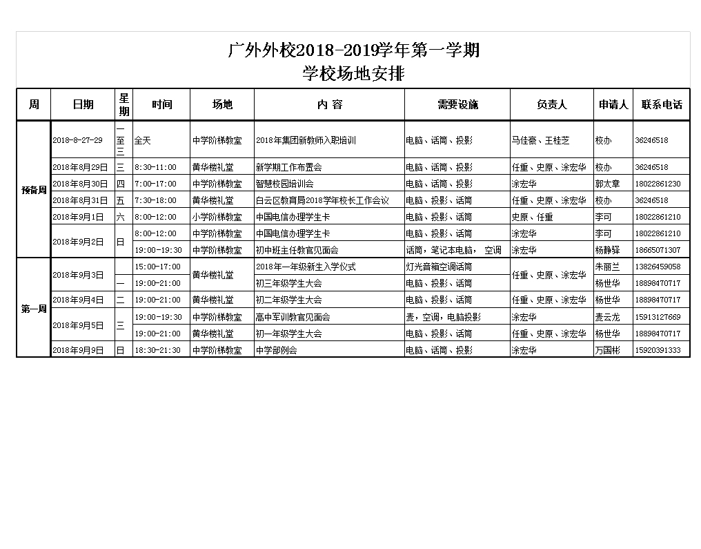 2018-2019第一学期(预备周、第一周)场地安排