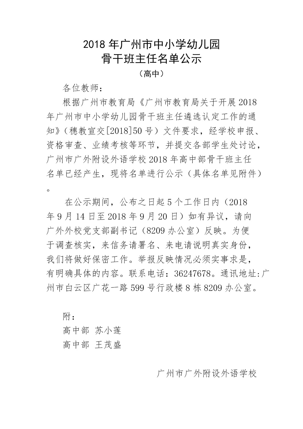 2018年广州市中小学幼儿园骨干班主任名单公示(高中)