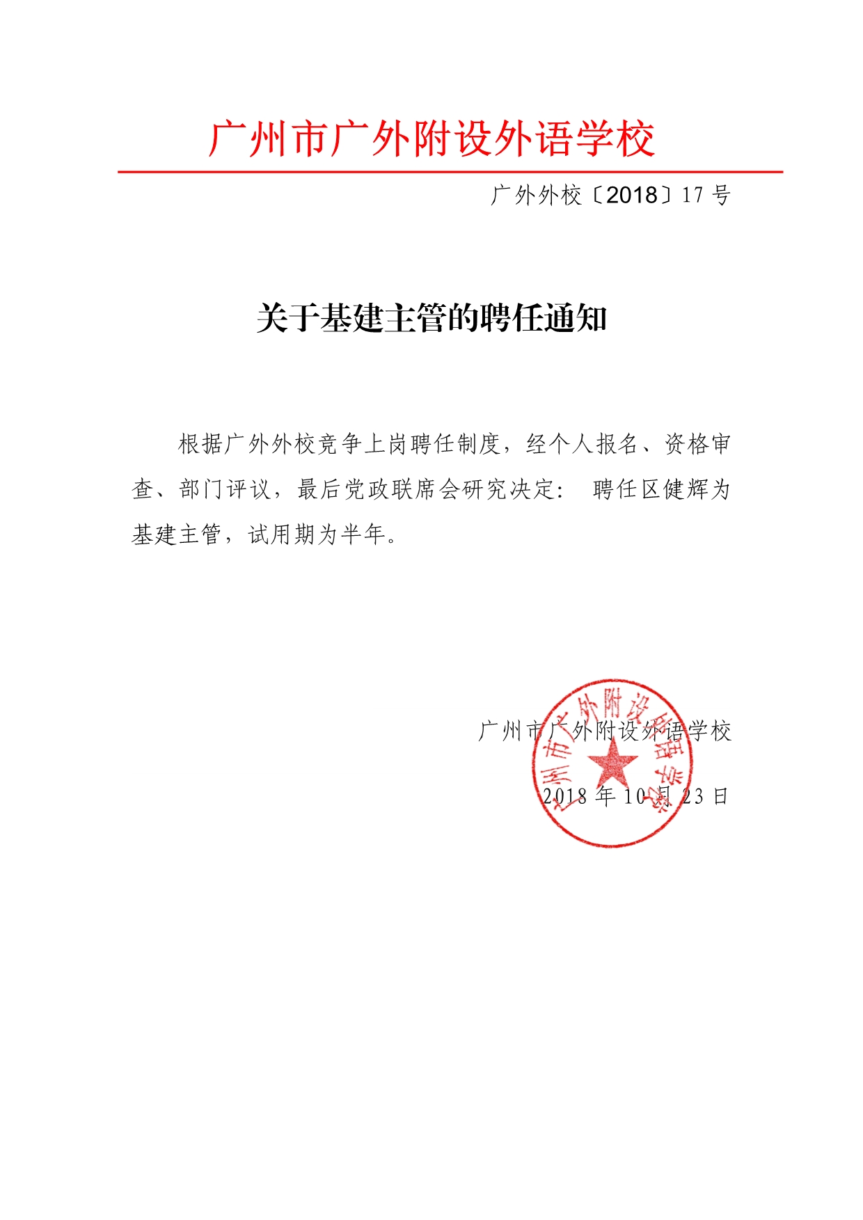 关于基建主管的聘任通知