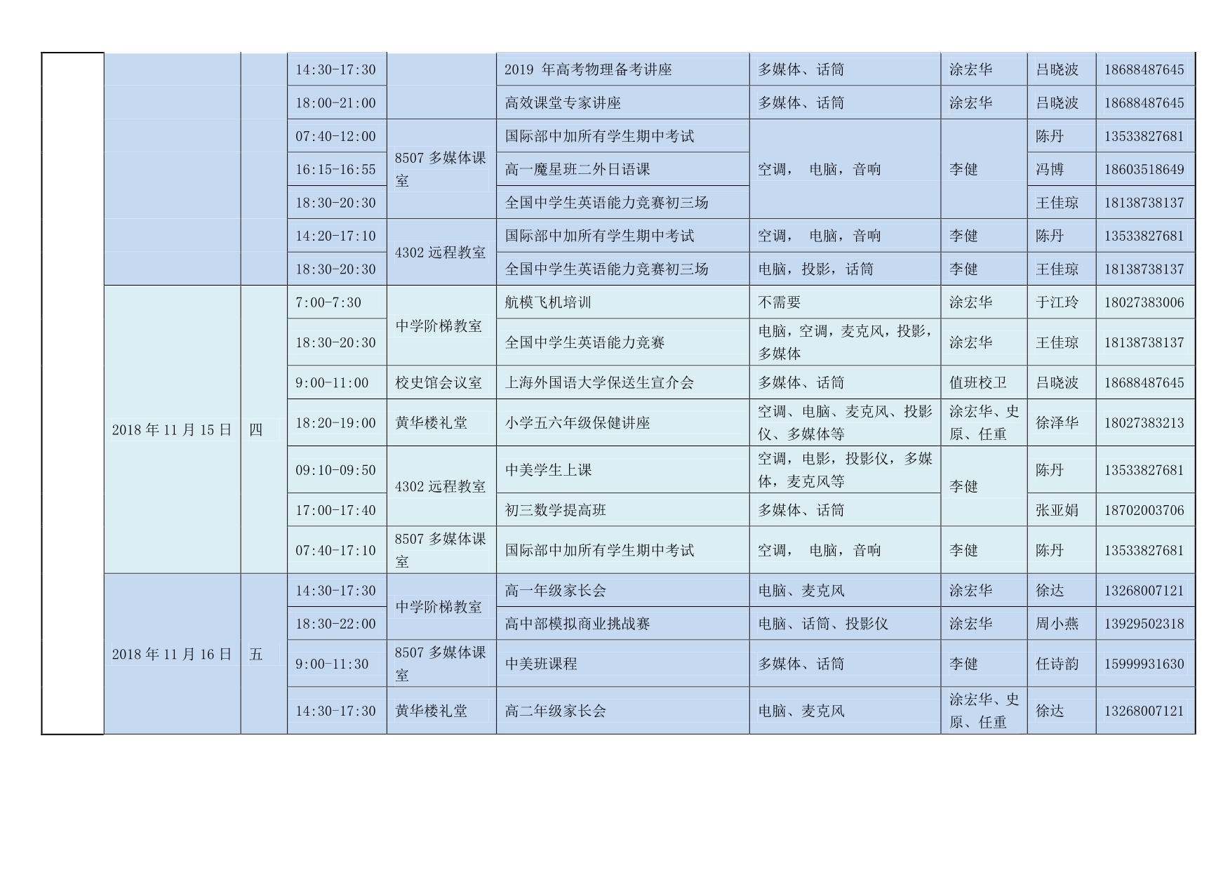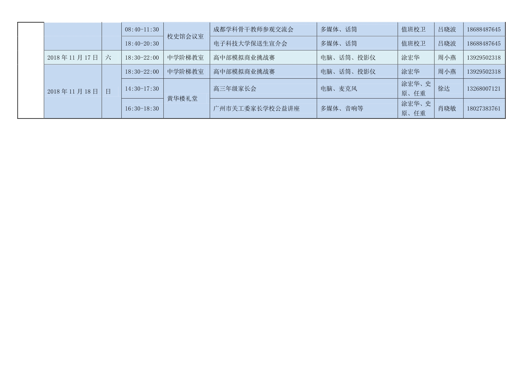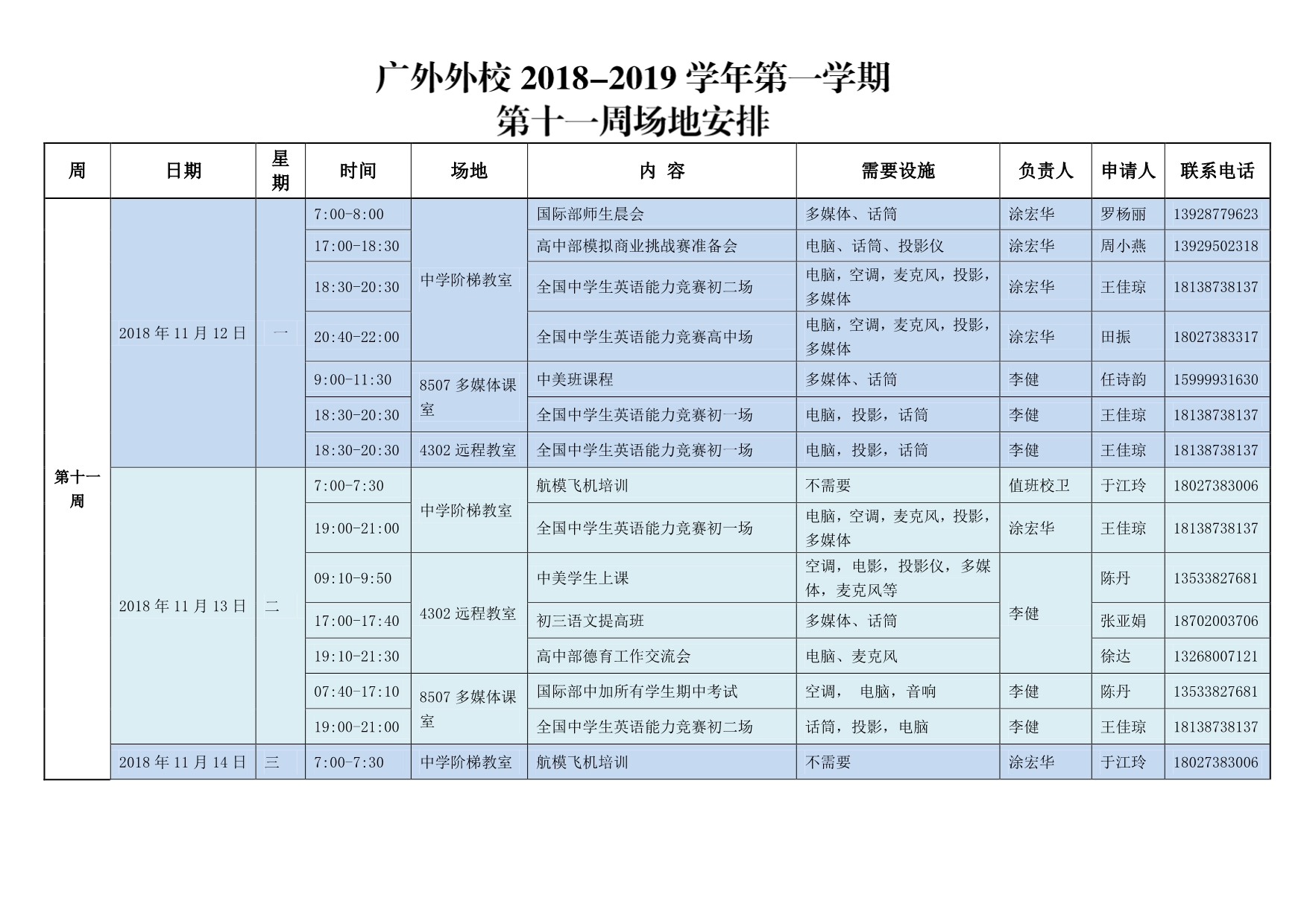 2018-2019第一学期(第十一周)场地安排