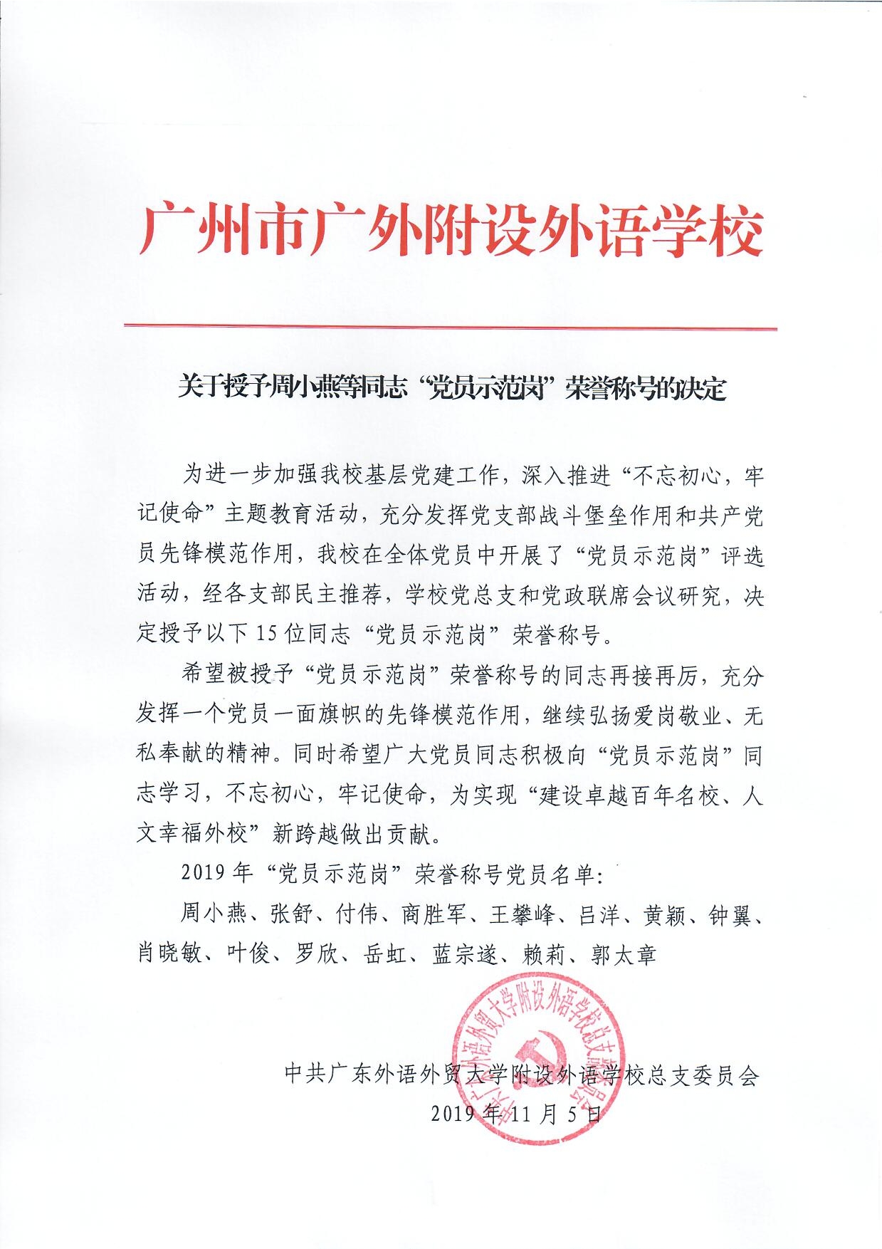 关于授予周小燕等同志“党员示范岗”荣誉称号的决定
