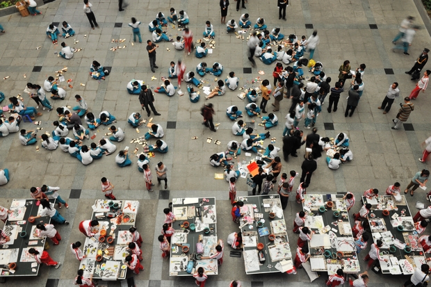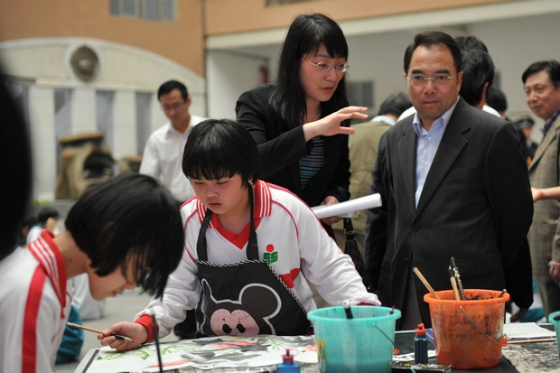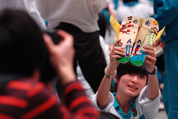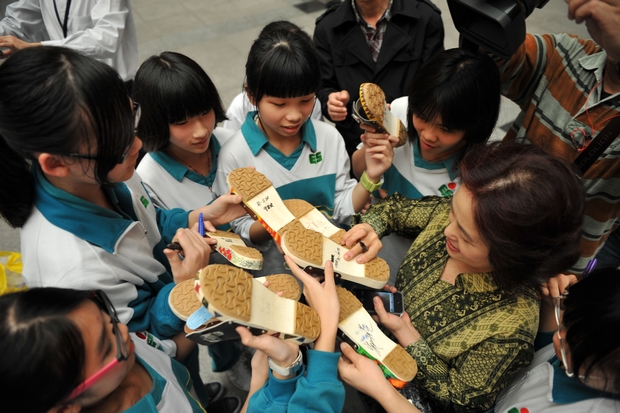学校中庭,一场木屐彩绘活动正举行得有声有色,近百名学生现场挥毫作画。在近距离观察同学们的作品后,朱明瑛发出一声惊呼:“你们是怎么想到在木屐上画画的?真让人意外。”她拿起相机一阵狂拍,掩饰不住嘴角的笑意:“这趟来对了。今天我是一定要买几双拖鞋回去,学校能为学生创造出这么好的艺术环境,我真为孩子们感到高兴,我太喜欢外校了。”