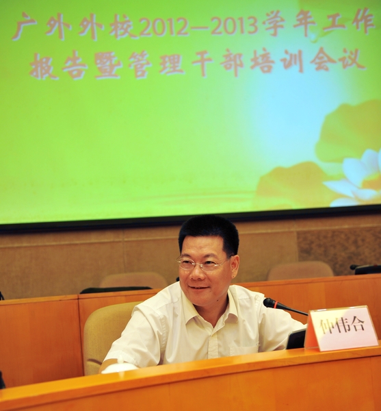 24日上午,广东外语外贸大学校长仲伟合出席了当天的会议并做了讲话。仲伟合校长首先肯定了外校在过去十九年中取得的成绩。他说,广外外校全体教职员工怀着对基础教育事业的赤诚之心,艰苦创业、努力拼搏,走出了一条勇于开拓、敢于创新的素质教育发展之路。如今,外校已经成为我省基础教育的一个知名品牌