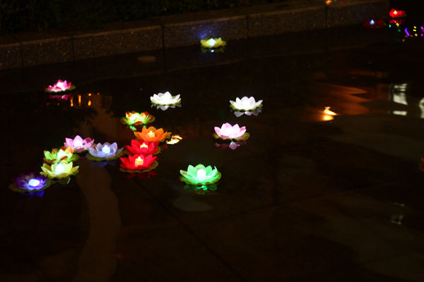 “快看,那边的莲花灯好漂亮!”一阵惊呼过后,人潮涌向学校红色雕塑所在地。在激烈的“商战”后台,学生会还开辟出一块安静的区域,作为中秋祈福专区。原本凹陷的水泥地面,竟然摇身变身成为了“许愿池”。五颜六色的莲花灯在水面随处飘荡,星星点点十分美丽,颇有中秋气氛。