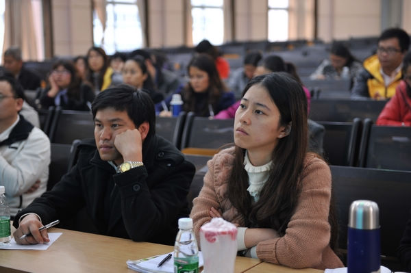 在谈到我校德育特色时,蒋亚辉提出三点:一是管理特色,十二年一贯制德育目标体系,每个年级都有规划、有目标;二是课程特色,围绕办学理念开展校本课程建设,为学生发展需要开发校本课程,推动学生高出口,使人真切感受到素质教育;三是活动特色,活动育人丰富多彩,学生能够在活动中提升综合素质。蒋亚辉还特别向在座教师推荐了我校电视台自导自演的春晚节目《笑晕会》,他建议老师们上网搜索观看,他说,整个视频从导演到演员都是外校师生,反映出外校校园文化的多姿多彩,从中也不难看出外校育人特色的形成。