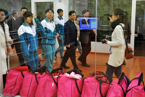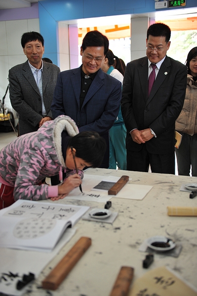 陈云贤一行先后参观了我校文化长廊、小学生宿舍楼、艺术培训中心以及体育馆。在见到我校学生“导游”时,陈云贤立即与学生们一一握手,一下子拉近了与学子之间的距离。当听到学生张馨元用流利的英语介绍我校文化长廊,陈云贤大为惊讶,向广外校长仲伟合感叹道:“外校学生的英语并不亚于大学本科水平。”