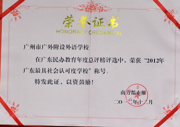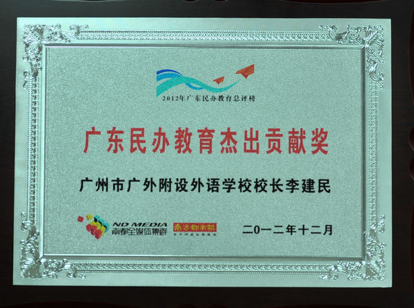 日前,由《南方都市报》主办的2012年度“广东最具社会认可度学校”的评选活动中,我校从众多的民办教育机构中脱颖而出,获得“广东最具社会认可度学校”称号。同时,李建民校长获得“广东民办教育杰出贡献奖”荣誉。