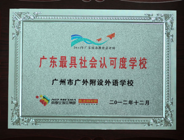 获奖理由:该校是由广东外语外贸大学创办的一所以英语为特色的素质教育实验学校。自1993年9月创办以来,始终坚持以“对每个学生的终身发展负责,培养走向世界的现代人”办学宗旨,经过十余年的发展壮大,学校的办学水平和英语特色得到了社会的广泛承认。是广州市白云区十大民办学校,被教育部认定为具有推荐保送生资格的全国13所外语学校之一。同时荣获全国民办中小学优秀学校、全国外国语学校工作研究会理事学校、广东省一级学校、广东省“十佳民办学校”等称号。