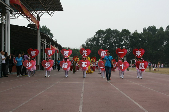 运动会开幕式气氛热烈、盛况空前。在激昂的运动员进行曲中,国旗护卫队、校旗队、彩旗队、花束队、教师方队、运动员方队依次进场。他们英姿飒爽、步伐矫健,鲜花、彩旗与灿烂的笑脸交相辉映。特别是各年级方阵,他们意气风发,口号嘹亮,昂首阔步依次通过主席台接受检阅。造型独特,极具寓意的方阵令观看的家长、师生们发出阵阵欢呼,现场气氛欢快而热烈。