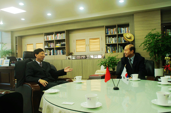 李建民校长与韩国环球视野学校教育系统董事长南镇奭亲切交谈