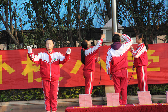 首先是升旗仪式。当火红的国旗和美丽的朝阳一起冉冉升起时,伴随着庄严的国歌声,每个人心中都满怀期冀种下了春天的希望。