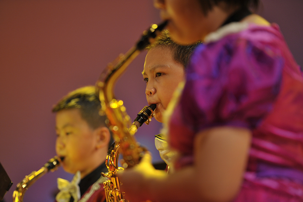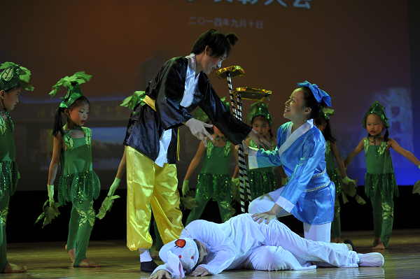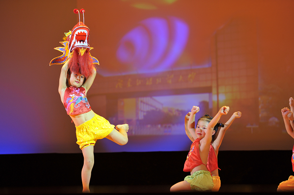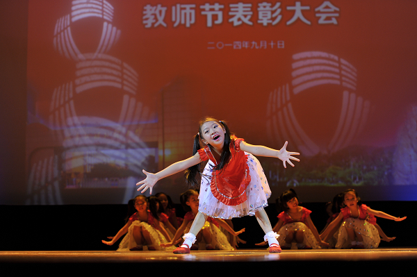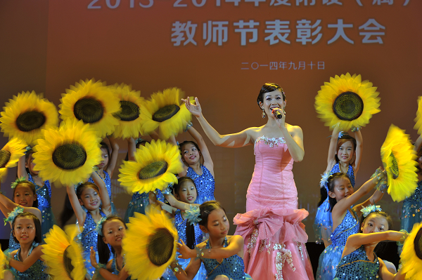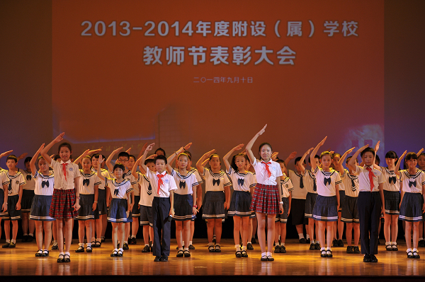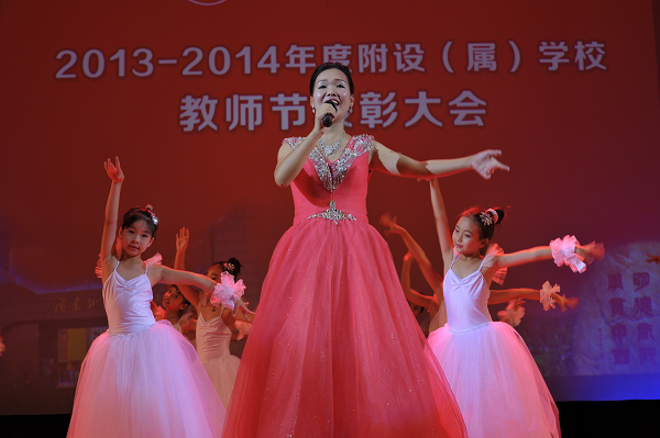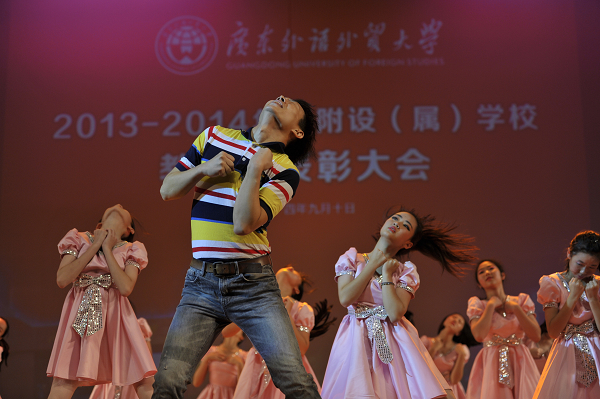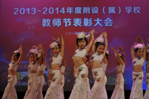 颁奖结束后,在场嘉宾共同观看了精彩的文艺汇演。五所基础教育学校都为文艺汇演贡献了精彩的节目。其中,广外外校的管乐合奏气势恢宏、激情四射,幼儿园的童话剧《守株待兔》师生同台充满童趣;增城外校的歌舞《新星升起》是在广外的校歌《凤鸣岭南》的旋律上谱出了新词,肇庆外校的舞蹈《我可喜欢你》演出了孩子们的天真活泼,单纯可爱。值得一提的还有,附属中小学专门为本次演出创作了一首配乐诗朗诵《献给广外基础教育教师的歌》,为广外基础教育战线上的广大教师献上了一份美好的节日祝福。