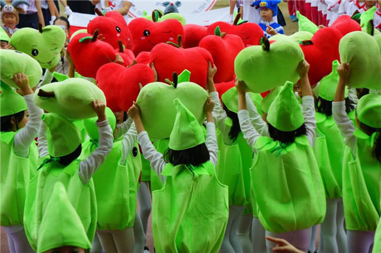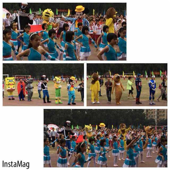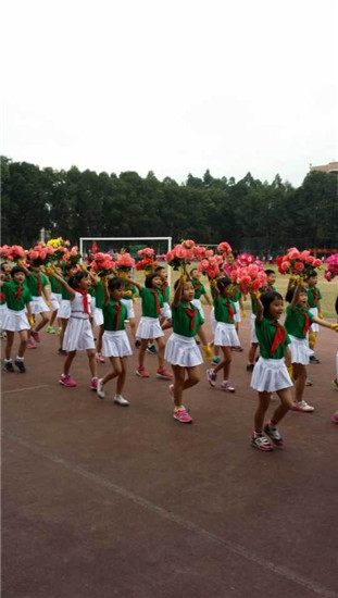 小学部62个班级组成的运动员方阵昂首阔步依次通过主席台接受检阅。各个方阵出场方式都独具匠心,无论方阵服装、道具、口号都极具寓意,与时俱进,充满了积极向阳的运动精神。灿烂金星、绚烂花球、各色笑脸、美丽向日葵、创意独特的十二生肖、超萌的小苹果、可爱的海绵宝宝、威风的奥特曼超人、魅力四射的辣妈、高大帅气的举牌爸爸……各种流行元素齐上阵,让人感觉仿佛来到了儿童乐园。每一个方阵走过,都赢得观看的家长、师生们阵阵掌声和欢呼,现场气氛欢快而热烈。特别是一年级方阵的小苹果舞蹈表演让全场气氛达到高潮,整个田径上都回响着小苹果的旋律与歌声,孩子们都在放开嗓门合唱。观众直呼:真是High翻天的运动会!一年级家长啦啦队舞蹈方阵的辣舞表演更是赢得满堂喝彩,大家都说,小苹果好甜,辣妈好辣!前来观看开幕式表演的一四班学生王卓然妈妈由衷地说:“开幕式上,靓妈独领风骚,帅爸龙马精神,宝贝表演卖力,老师成功组织,一切为了孩子。令人感动!”