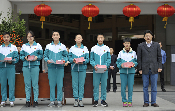 谢仁发鼓励中学部、国际部同学,要在新的学期里坚定信念,脚踏实地、顽强拼搏,努力成为具有“爱国、敬业、诚信、和善”的合格公民,努力成为具有现代意识、世界视野、走向世界的现代人。