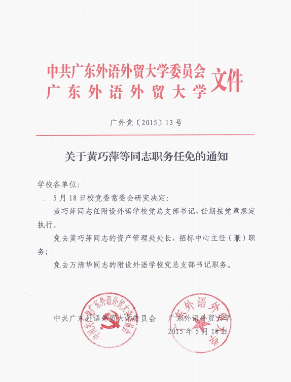 会上,广外党委组织部部长方迎生宣读了《关于黄巧萍等同志职务任免的通知》:黄巧萍同志任附设外语学校党总支部书记,免去黄巧萍同志资产管理处处长、招标中心主任(兼)职务;免去万清华同志兼任的附设外语学校党总支部书记职务。