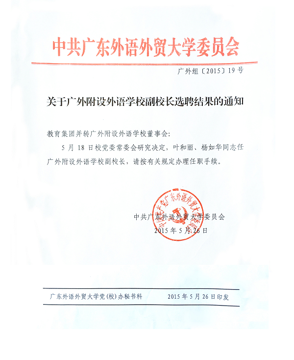 会上,广外党委组织部副部长郝建萍宣读了《关于广外附设外语学校副校长选聘结果的通知》:经5月18日广外党委常委会研究决定,叶和丽、杨如华同志任广外附设外语学校副校长。