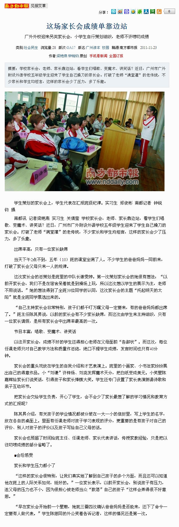 五年级迎来了学生自己操刀的家长会,老师、家长靠边站。这样的家长会打破了老师“满堂灌”的老传统;不少家长和学生均坦言,这样的家长会少了压力,多了乐趣。——网址:http://gcontent.oeeee.com/d/6e/d6ef5f7fa914c199/Blog/2ef/75b971.html