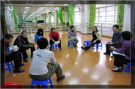 2011年11月22日上午十一点,在听完艺术组四位老师的推荐课后,老师们来到艺苑中心舞蹈室里,举行了“校本课程与团队建设”的教研沙龙。