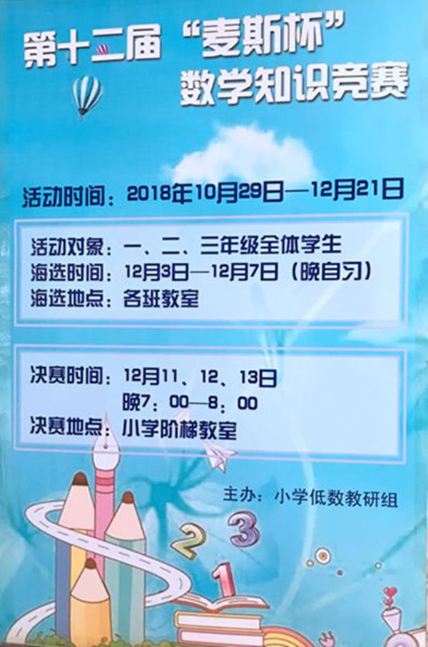 10月29日,第十二届“麦斯杯”小学数学竞赛活动全面启动。结合每学期征订的《少年智力开发报》,低段数学教研组利用周末、晚自习等课余时间,组织学生阅读数学报,做数学报,对学生进行运用数学知识解决问题的训练,并于12月3日—12月7日,在各班教室进行海选活动。