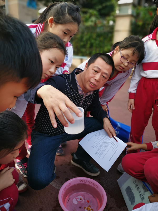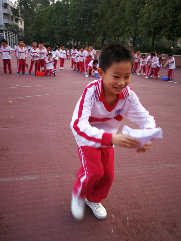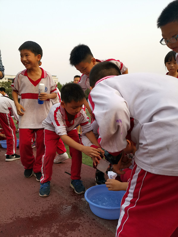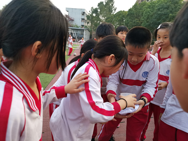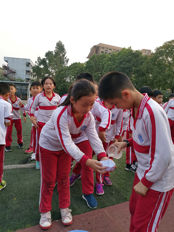12月 4 日下午活动课时间,三年级同学在小学田径场举行了一场别开生面的接力赛,接力棒是用A4纸折成的纸杯,用纸杯将水从起点运到终点。原来这是第9 届科技节的又一特色活动。