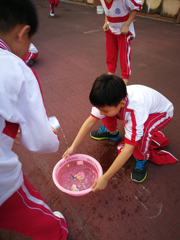 纸遇水会湿,人人都懂的道理,却让三年级的同学玩出了新花样。活动规则是用一张A4纸折成纸杯运水,不能用任何工具。比如双面胶、透明胶,跑到指定位置把水倒进脸盆,再跑回去,把纸杯传给下一个同学,每个班12位同学,如果中途纸杯破损不能再盛水,本班就要退出比赛。最后是看哪个班脸盆里的水多,哪个班获胜。所以同学们的纸杯必须满足两个条件:容积大,能装水;不容易破损。