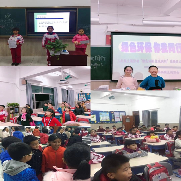 12月16日晚,我们在各班教室举行“绿色环保 你我同行”结题仪式,评选出10名“环保小卫士”,表彰先进。让我们用行动来影响他人,带动他人共同爱护环境、保护环境,推广普及环保知识。