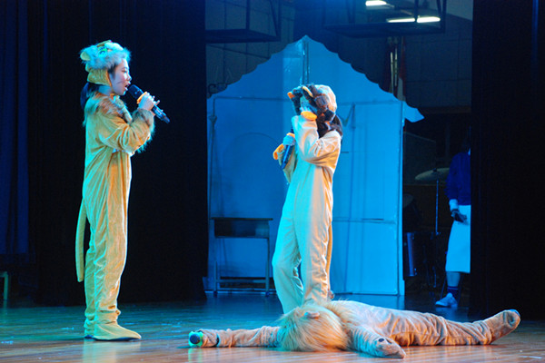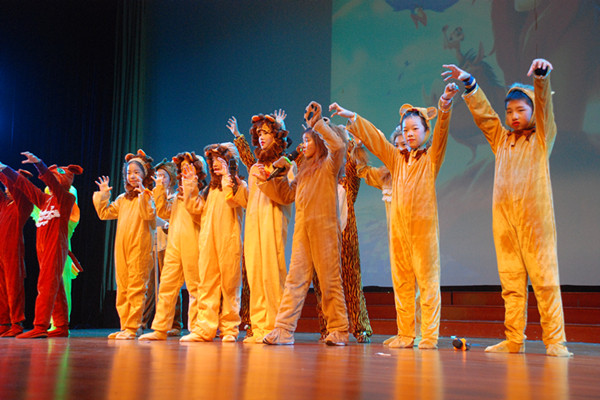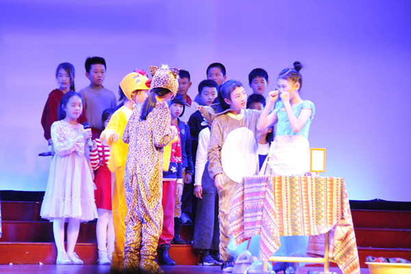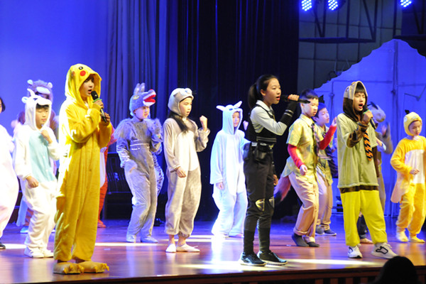 五年级的老师们为晚会精心准备的则是英语配音节目。尽管主要是配音,但老师们可谓“极尽英语语用之能事”,孩子们在节目中不仅能配音,更唱能跳,能弹能演,原本单调的配音节目在舞台上变出了“花”来。五(9)、(10)班的节目《里约大冒险》,在配音节目过后,从后台出来了许多孩子,他们与台上配音的同学汇合,排列出错落有致的队形,一起欢快地唱起了《real in Rio》,热闹的舞台与热情动感的歌声将刚刚被配音节目“驯服”了的会场一下子又调动了起来。又如,五(7)和五(8)的作品《疯狂动物城》将当晚的表演推进了一个小高潮。同样是动物主题,尽管角色要少一些,但老师与孩子们的付出并不因此而有所打折:动物服装精心准备,尤其是兔子警官的造型十分个性别致;演员语音生动流畅,很好地把握到了所扮演角色的情感。配音过后,后台也涌出许多的“小动物”。一时间,狮子、斑马、 小熊和猎豹们都欢聚在舞台上,为在场的观众带来了一段精彩的群舞,过程中队形不断变换,时而成为方阵,时而变成篝火圈,与“动物城”的主题再次呼应。据负责的张老师介绍,为了本次演出,班级请了专业的舞蹈老师帮助排舞,并在舞蹈中加入了几种不同的舞蹈元素,诚意满满。
