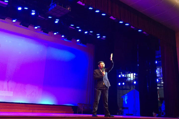 在一系列节目演出过后,晚会来到了中场互动环节。但这次的中场互动却成为了今年晚会的亮点之一,这当然归功于孩子们对英语节高涨的热情,但也要感谢来自高英组的主持人——王老师。虽然身为男老师,但王老师热情洋溢、风趣幽默,说捧逗唱样样行。他不仅为同学们准备了许多有趣的英语文化题目,更和台上的小舞者一起热舞,带领全场的孩子、家长和老师们跳起了动感十足的《Macarena》。大人孩子一起“扭扭屁股,甩甩手”,会场顿时成为了欢乐的海洋,好不热闹!