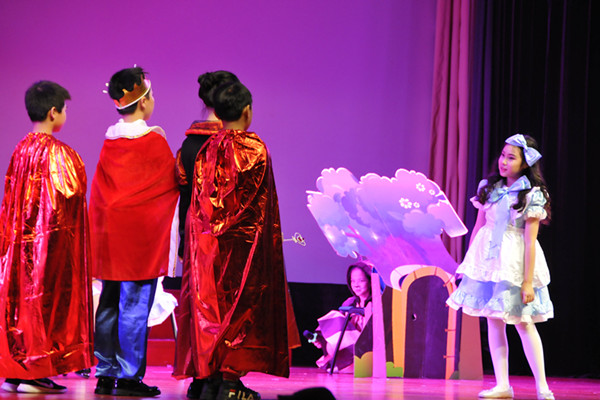 首先将会场点燃的,是由四(1)、(2)班带来的英语剧《爱丽丝梦游仙境》。精美梦幻的舞台布置,以及五彩缤纷的灯光效果在节目伊始就抓住了全场观众的目光。而四(3)、(4)班《小红帽》的舞台效果同样夺目,剧中饰演主角小红帽的何羿霏同学也是黄华楼礼堂的常客。剧中的几幕情景中,小红帽与动物朋友们唱歌跳舞,在群舞和独舞中,她舞姿蹁跹,歌声灵动悦耳,为了戏剧真是拿出了看家的本领!舞台上的她精灵可爱,惹人喜爱,为观众带来了一位不一样的小红帽。当然,最让观众沉醉的莫过于这些小演员们生动的表演以及漂亮的语音语调。根据情节的需要,小演员们时而悲伤哭泣,匍匐在地上进行大段独白,大秀“台词功底”;时而欣喜无比,跑跳跃动展示自己优美的舞姿;整段表演视觉冲击强烈,张力十足。又如四(8)、(9)班的作品《狮子王》,经典的作品往往意味着观众较高的期待,但这次的《狮子王》没有让挑剔的孩子们失望。作品不仅角色众多,而且分幕也不少,这对培训的老师们和参演孩子们无疑是一项挑战;但在舞台上,观众看到了性格鲜明的角色、精致多样的服饰、自然流畅的情节推动,甚至欣赏到了精彩的非洲风情集体舞,这些细节的背后都是演出者们的用心,所谓“台上一分钟,台下十年功”,说的就是这样认真的师生吧。