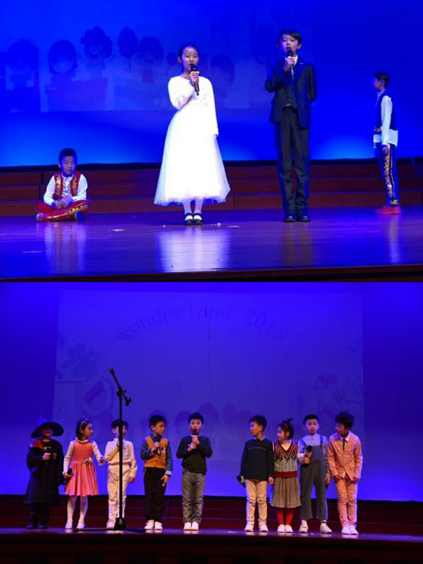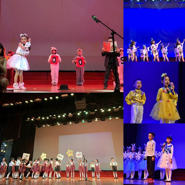 Edelweiss, Edelweiss, every morning you greet me.伴着晚7点的钟声,二11&12班的孩子唱着译为“雪绒花”的歌曲,穿着蓝色的礼服,拿着“雪花”道具出现在大家眼前。如果你向往太阳,一首You are My Sunshine绝不要错过。看,二1&10的孩子像小太阳般,活泼又童趣地为大家献上了这首温暖人心的歌儿。如果你喜欢表演和唱歌的结合,二4&6班的Short a Fat Cat一定不会让你失望。如果你喜欢动感的英语歌曲,Hokey Pokey值得一试。外校孩子的必备曲目——My Happy School的呈现,不仅演唱了英语歌,还有课前“老鹰抓小鸡”的游戏,配上平时学习生活的照片,感动之余是不是也想来体验作为ESer的幸福?除此之外,白色猫咪的活灵活现和英语歌曲的碰撞,是不是让你目不转睛呢?