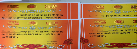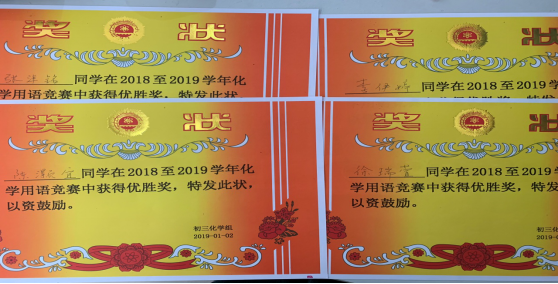 本次比赛,从前期的命题制卷、年级组的协调安排,到考试当天各班的监考,化学组教师全员参与。在考试的过程中,学生们也都积极参加,认真努力答题;赛后,化学组全体老师随即进行了集体流水阅卷。经老师们对试卷进行仔细批阅与等级评定后,每个班最终有5人获奖,分别是班级前五名。随后,初三年级组给获奖同学隆重颁发了荣誉证书和奖品,以资鼓励。