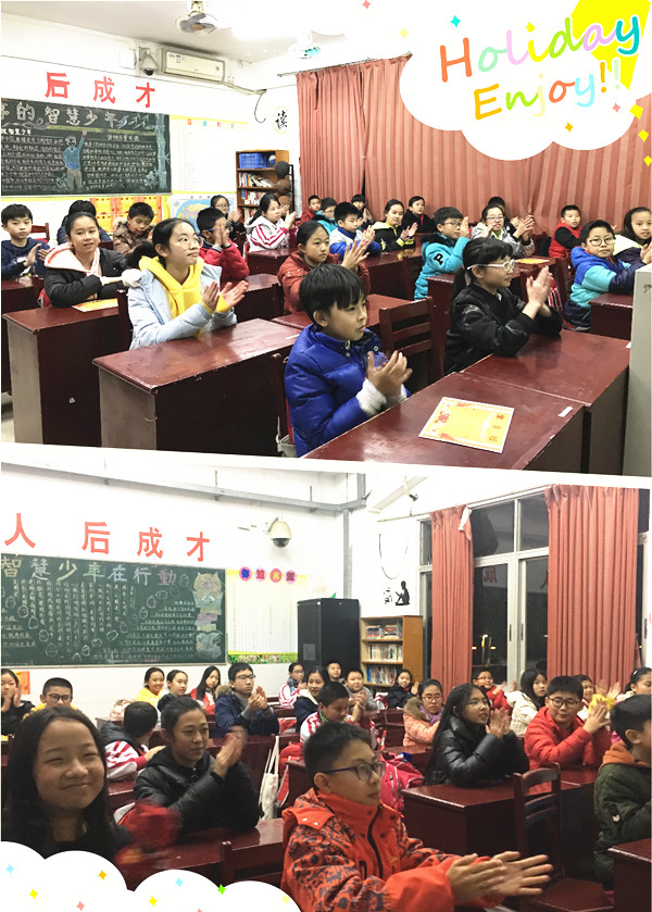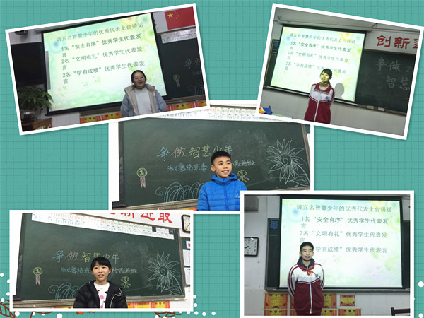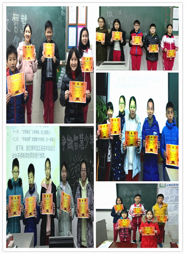 1月1日晚上七点30分,当班会的铃声划过校园,六年级各班按时召开班会。各班的小主持人在班主任的指导下,以满怀的热情,精神饱满地主持着班会。班会过程中,同学们或认真聆听同学的回答,或积极举手发表自己的见解,或各抒已见畅谈自己在活动中的感受与收获。班会中,班主任还对在活动过程中被评为智慧少年的优秀同学颁发奖状,进行表扬。