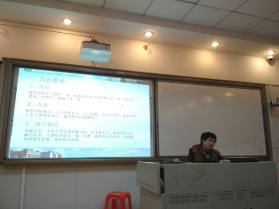 通过随机抽点名的形式,语文、数学、英语、物理、化学、政治了、体育学科各随机抽取一位老师来介绍在科组的基础上结合自己班级实际来设计的个性化的作业。从发言的老师来看,每一位老师都是在科组的共有作业的基础上,精挑细选、精心设计自己班级的作业。真可谓:精益求精匠心独运。