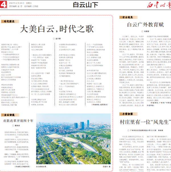 小学部刘蒙蒙老师《白云广外教育赋》获区委宣传部、区文联联合表彰和奖励。据悉,以“弘扬时代精神·谱写白云新篇”为主题的庆祝改革开放40年征文活动,自今年10月启动征稿以来,共收到社会各界人士投稿作品近百余篇,包括小说、散文、诗歌、杂文等体裁。区文联相关负责人表示,本次征文活动投稿作品集中反映了我区新时代的新变化,题材新颖、文字流畅、情感自然、故事生动。投稿群体既有本土作家,一线教育工作者,也有新一代的学生群体。