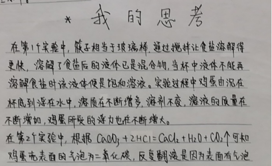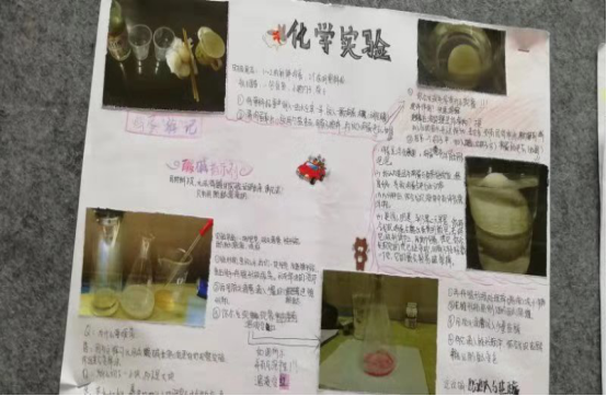 感悟反思:这是我们科组第二次尝试,还存在很多值得完善的地方。比如,趣味小试验的选材还是太局限,下一年可扩展更多的有趣实验:如写密信,制作叶脉书签,大象牙膏、喷泉实验……比如,在学生前期实验指导还不够详细,不知道该记录什么如何写实验报告;比如,排版和纸张要求,本次作业质量参差不齐,纸张太小,以后我们要用统一规格稍大点的纸张,实验报告大致的要求也需明确。这样出来的作业质量会更高。尝试是成功的开始,有了尝试才会发现不足,才会改进,才会越做越好,日后的工作也需多的尝试,在尝试中摸索、创新、完善,不就是化学人该具备的科研精神吗?且思且行,且行且思,日思精进,祝愿我们初中化学组越来越好!