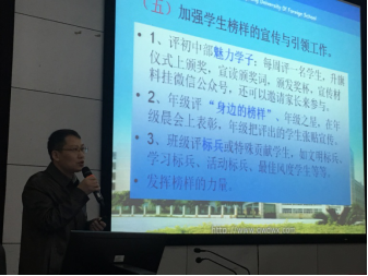 在本学期工作要点方面,杨主任首先谈到要做好学生精神文明建设工作。充分利用升旗仪式、年级晨会、班会课对学生的精神引领作用。(二)抓好常规管理工作,严格对纪律、卫生、仪容仪表、集会、安全值班的要求与督查,落实反馈制。(三)继续加强文化建设(制度文化、精神文化、环境文化)工作。形成良好的校风、级风、班风及宿舍风气。(四)加强家校合作,做好“协同育人”工作。组织好家长会、家长课堂、家长培训、亲子活动。(五)加强学生榜样的宣传与引领工作。每周一评初中部魅力学子,年级评 “身边的榜样”、年级之星,班级评标兵或特殊贡献学生。(六)继续做好“活动育人”工作。积极支持举办已有活动、鼓励创新活动,注重活动的实效性。(七)加强学生干部队伍建设,加强学生自主管理。(八)加强法制、禁毒、安全等方面的教育。关注学生心理安全,组织讲座,建立档案,加强干预,强调执行谈话机制等。(九)加强老师相互学习,促进团队成长。继续举办高质量德育经验交流会、班会课评比活动,加大外出交流学习,发挥名班主任工作室的作用。