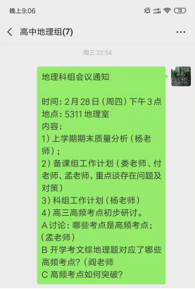 首先,杨爱军老师对上学期期末成绩作了简要分析。高一、高二年级地理平均分均居白云区第一,区前十名高一有3名,高二有8名。高三调研测试在保送生没有参加的情况下,平均分拿到区第三名。这样的成绩很好地体现了组内六位教师积极的工作态度,扎实的专业技能,高效的教学效果。