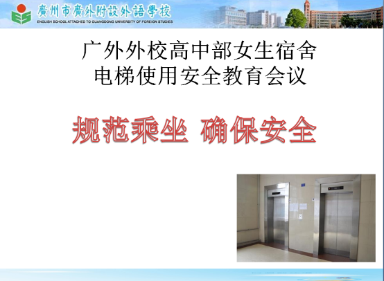 3月4日晚上21:30分,在《广外外校使用电梯安全注意事项》有关规定出台的当天晚上,高中部在中学阶梯教室召开高一高二女生关于乘坐电梯安全工作会议,本次会议主要落实学校党政联谊会会议精神,就如何教育和引导学生乘坐电梯安全注意事项。参加本次会议有高一高二年级主任、班主任和高中女生宿舍生活老师,会议由高中学生处罗兰主任主持。