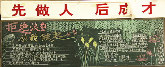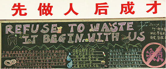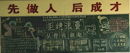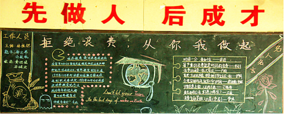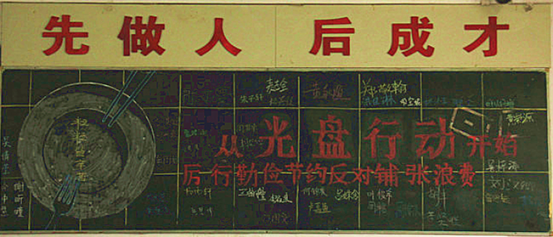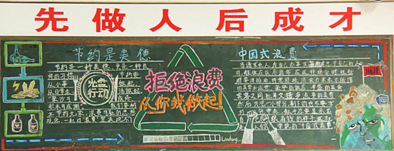 此次“光盘”行动具体实施过程分为四个阶段。一是宣传倡议阶段,重点是进行工作部署与宣传发动,以开展为期一周的“光盘”行动主题班会为载体强化宣传倡议;二是组织实施阶段,以班级为单位,各班进行黑板报制作与班会课形成呼应,起到积极引导作用。